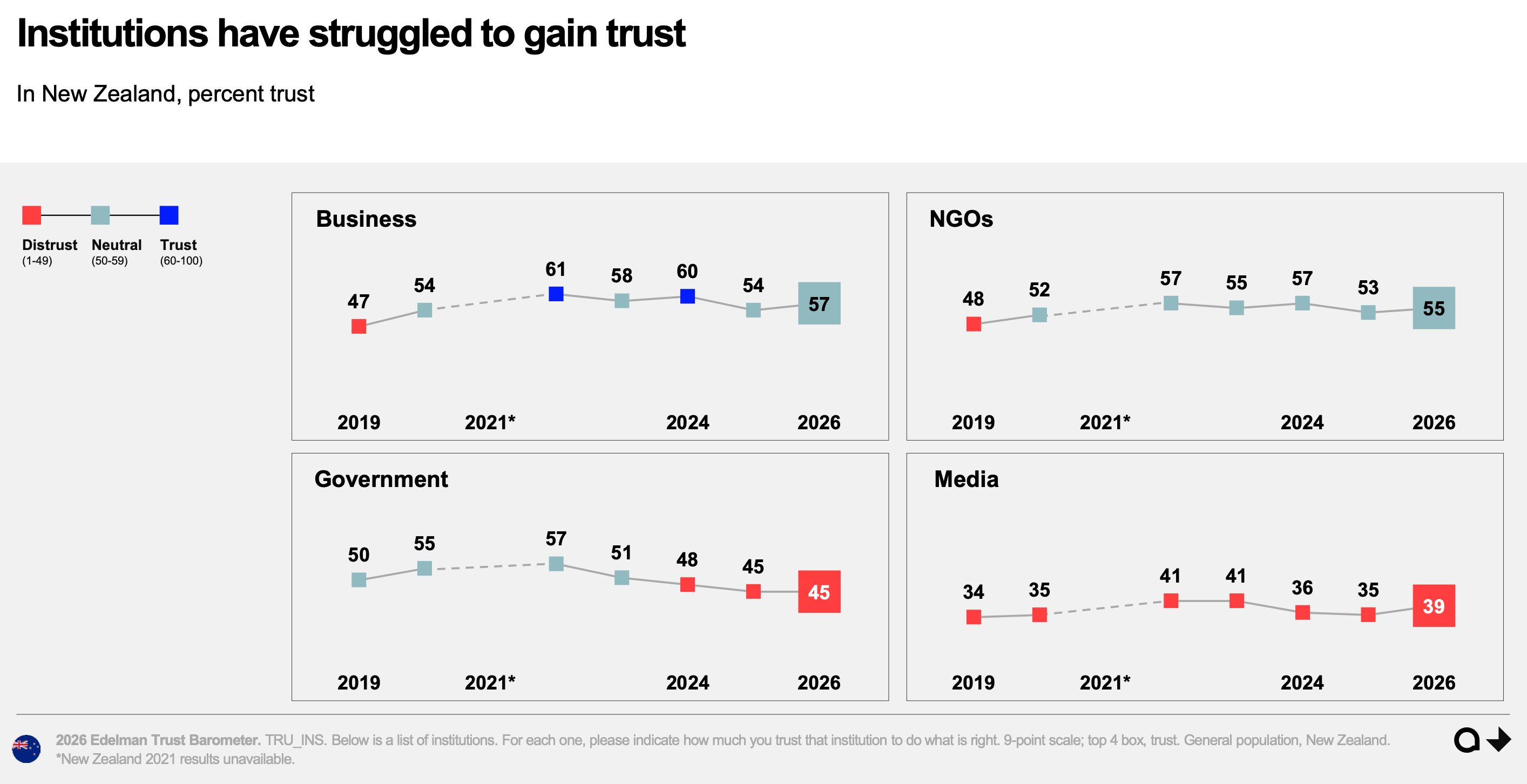 Looking at the results institution by institution, we can see that trust in government remains stuck at 45%, deep in distrust territory. Media has edged up from 35% to 39% – still the least trusted institution in the country. Business sits at 57%, NGOs at 55%.