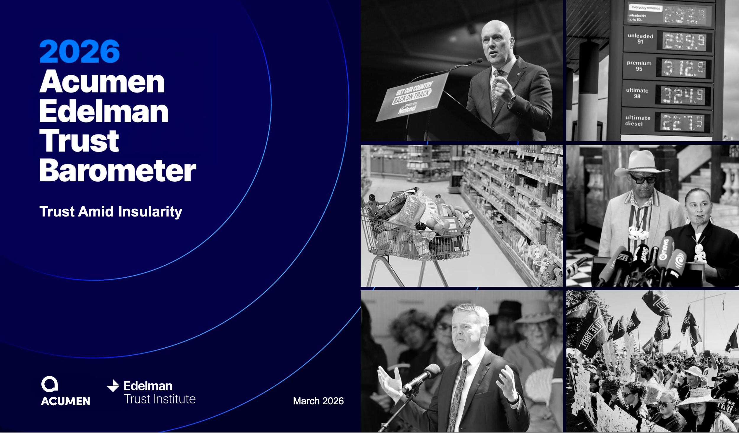 The Acumen Edelman Trust Barometer is an annual global survey, now in its 26th year, produced internationally by the Edelman PR firm and run locally by Wellington-based consultancy Acumen. This year’s theme is “Trust Amid Insularity,” which follows last year’s “Crisis of Grievance.”