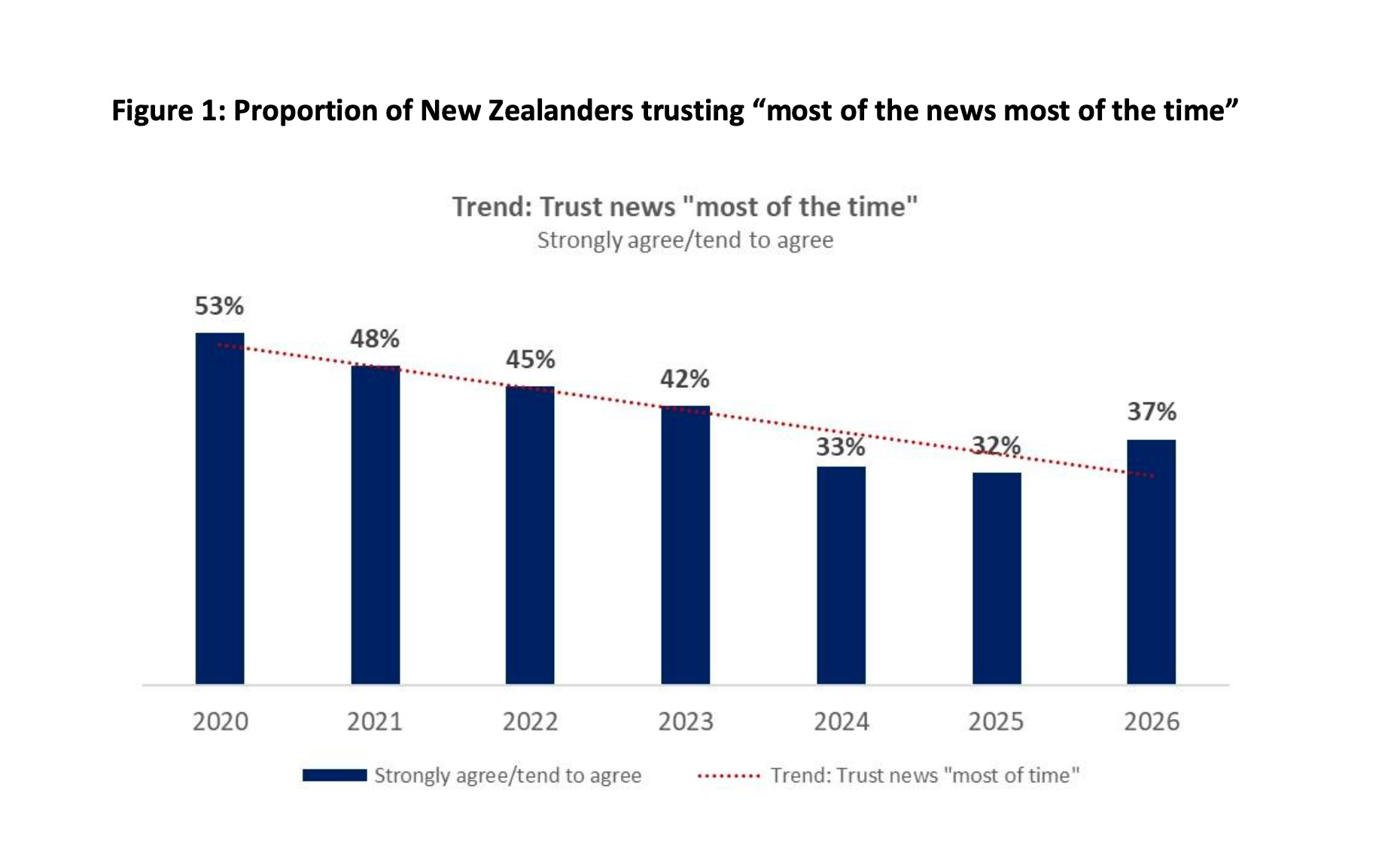 Yes, there has been a genuine improvement. For the first time since the survey began in 2020, the number of New Zealanders who say they trust the news in general has risen: from 32% last year to 37%. Trust in the news people personally consume also edged up to 50%, from 45% in 2025. The improvement is real. But the context matters enormously, and it’s easy to lose sight of it amid the cheerful framing.