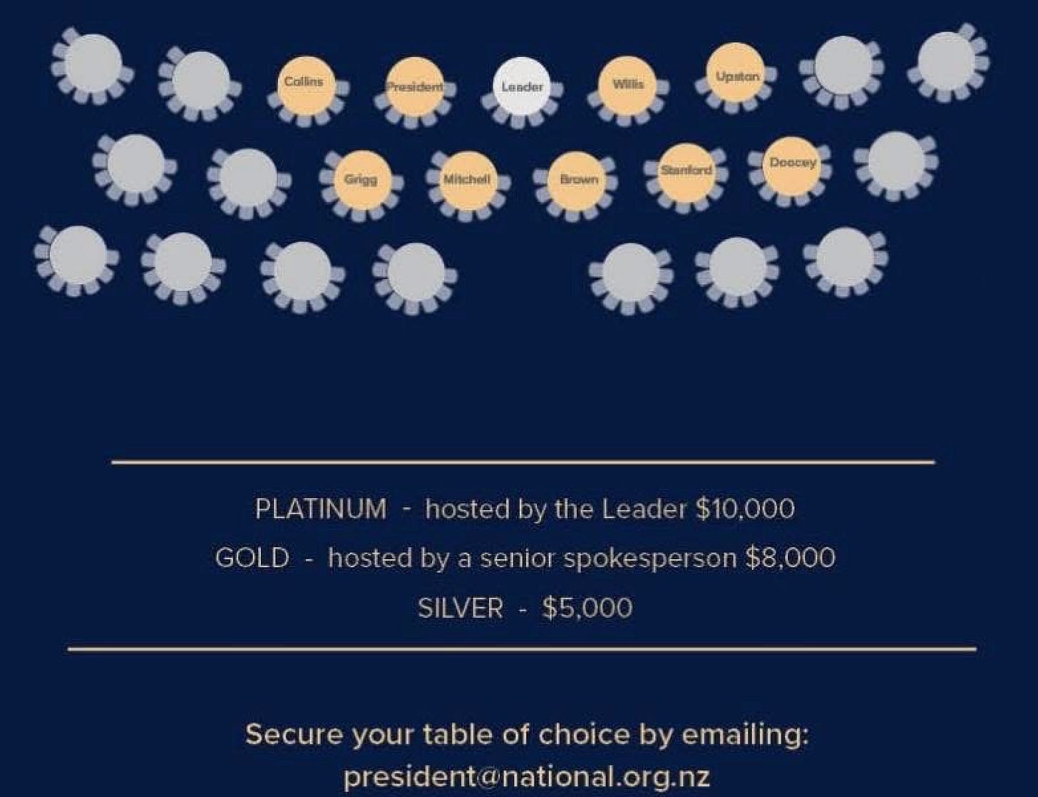 What makes this latest National dinner notable is not that it is happening. It’s the brazenness of the tiered seating structure. As I told the NZ Herald’s Ethan Griffiths, who broke the story, previous events of this kind have typically charged a blanket fee. Everyone gets the same access. “Whereas in this way, you’re actually getting a visual chart. A map of the power. You get to choose which table you sit at and which minister you get the ear of.”