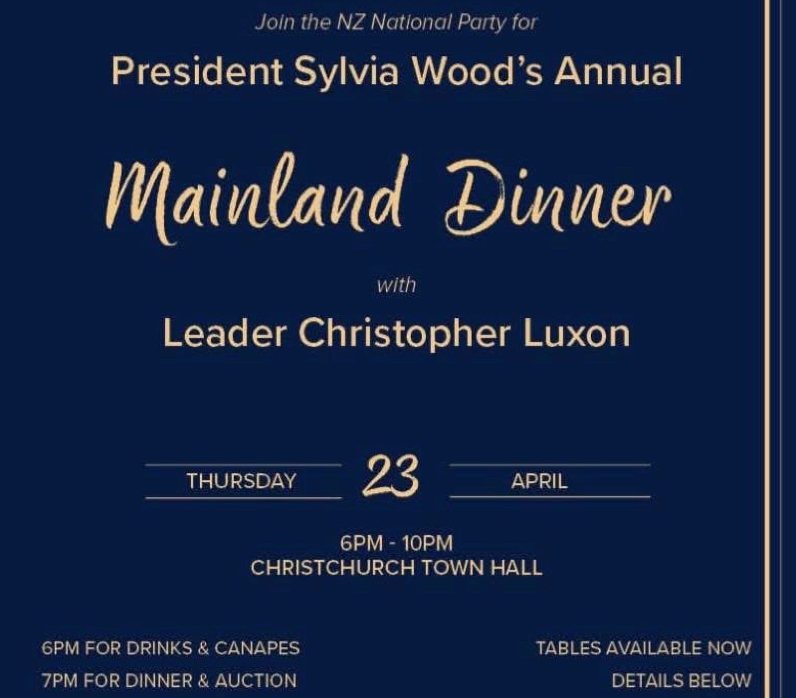 The National Party is holding a “Mainland Dinner” at Christchurch’s Town Hall next month, hosted by party president Sylvia Wood, and the invitation was accidentally posted on Facebook by National MP Maureen Pugh before being swiftly deleted.