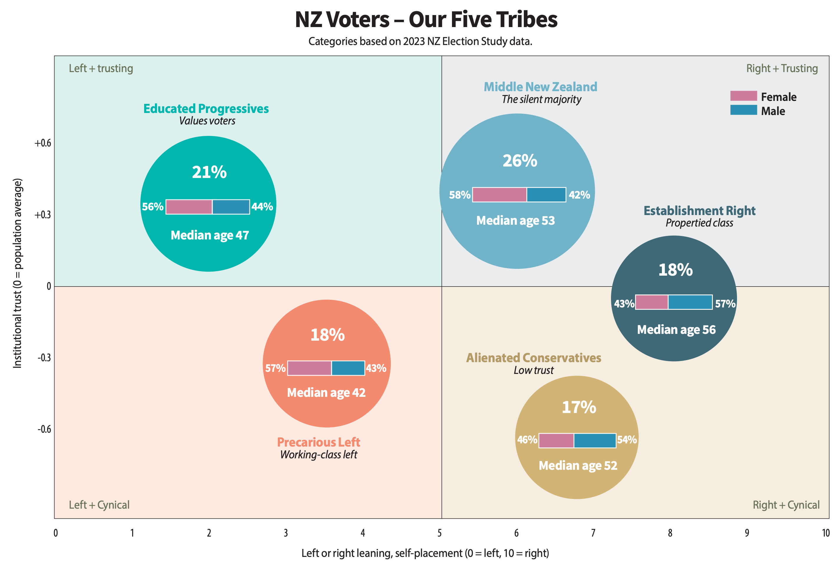 McLauchlan’s five tribes are: Educated Progressives, the Precarious Left, Middle New Zealand, the Establishment Right, and Alienated Conservatives.
