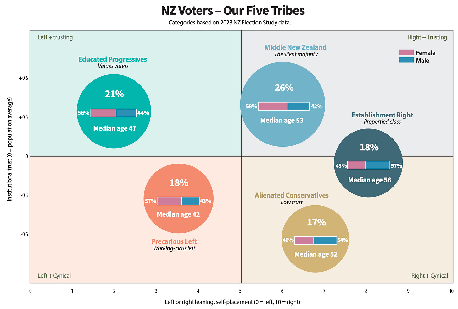 Middle New Zealand is the largest tribe at 26%, and the hardest to pin down, precisely because its defining feature is the absence of strong positions. Average age, average income, average education. On most of the values that define the five tribes, these voters sit close to the centre on almost everything. They are the most trusting group in the country. They trust Parliament, the government, the courts and police. In 2020, 42% voted Labour. In 2023, they swung to National at 39%. They don’t hate either major party. As McLauchlan writes, they “just vote for whoever seems competent.”