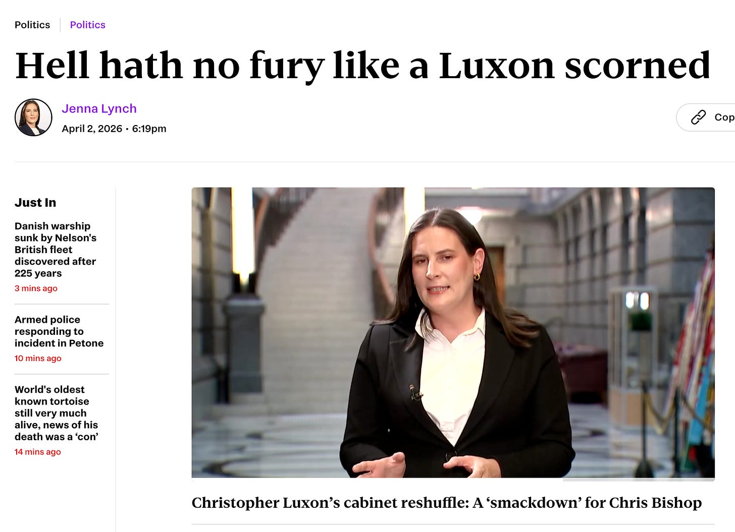 Lynch’s headline said it all: “It seems hell hath no fury like a Luxon scorned.” Luxon, she wrote, had chosen to “take a strike at Chris Bishop’s political heart.” Not by stripping away the big public-facing portfolios, but by removing the internal levers of influence: campaign chair and Leader of the House. Bishop still has the policy workload. What he’s lost is the power.