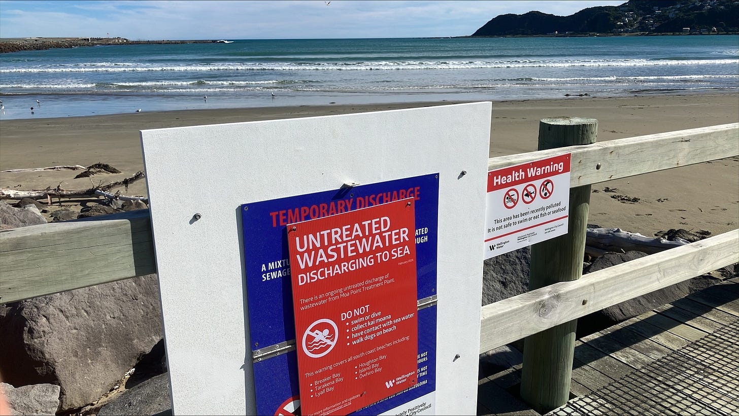 At the height of summer, during the Waitangi Day long weekend, approximately 70 million litres of raw untreated sewage have been pouring into the sea off Wellington’s south coast every day. Not from some Victorian-era outfall that predated modern treatment. From the catastrophic failure of the city’s primary wastewater plant at Moa Point, built in 1998 to end exactly this kind of dumping.