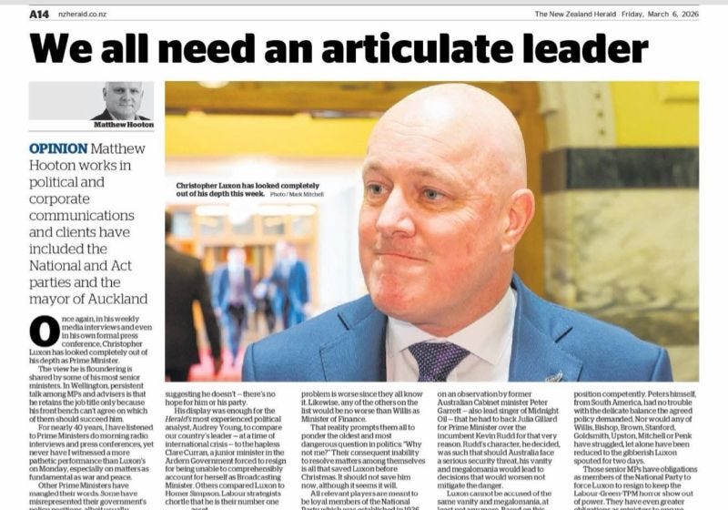 What’s most striking about this crisis isn’t that it’s arrived – Luxon’s weaknesses have been apparent for some time. It’s that the entire senior leadership of National can see the problem, privately acknowledge it, and yet remain frozen. As Ensor and Coughlan write: “And as of Friday afternoon, National isn’t entirely sure the Prime Minister is considering his future.”