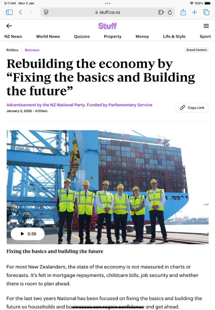 When a National Party advertisement appears on Stuff formatted to look like a news article, with only a small “Brand Content” label, the intention is clear: to blur the line between advertising and journalism. That this is funded by taxpayers makes it worse.