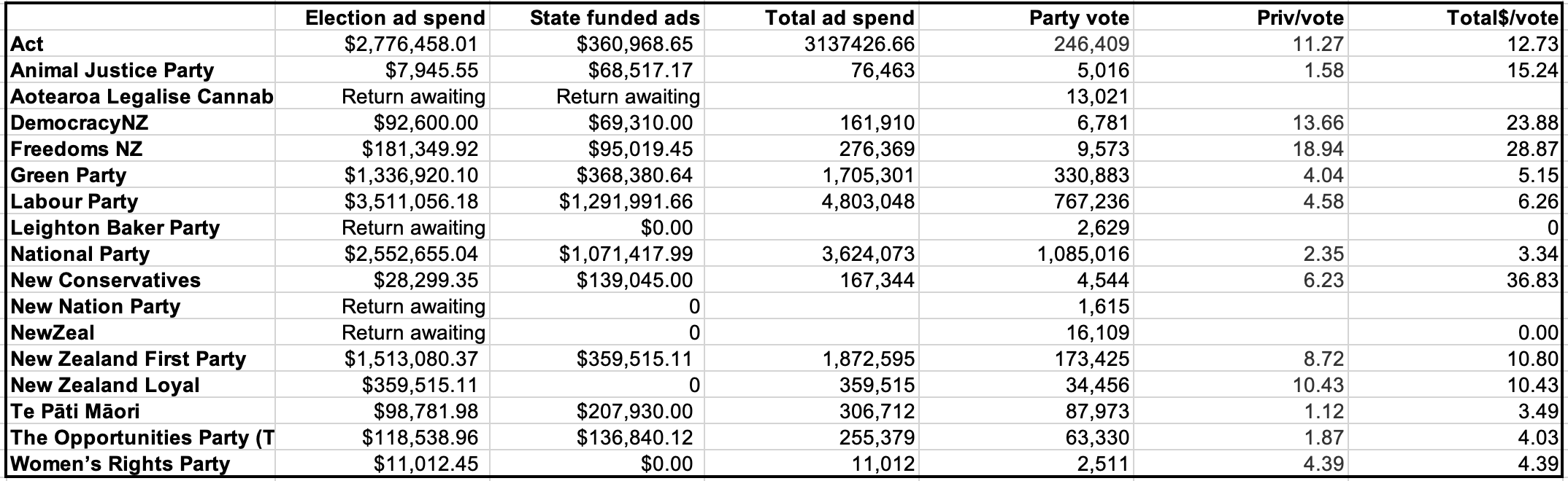 Of the parties outside of Parliament, TOP managed $4.03 per vote, DemocracyNZ $23.88 per vote, and Freedoms NZ: $28.87 per vote.