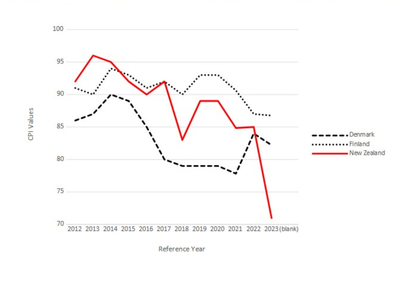 The graph below, with the red line representing New Zealand, shows the resulting dramatic decline in the perception by business leaders that this country has low corruption: