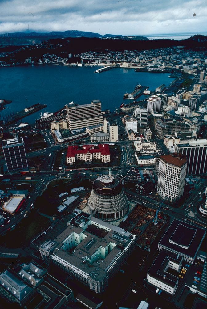 Nice aerial shot of the Parliamentary precinct and the capital's harbour and hills.