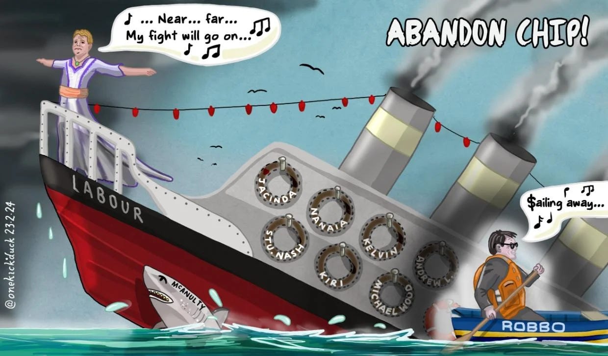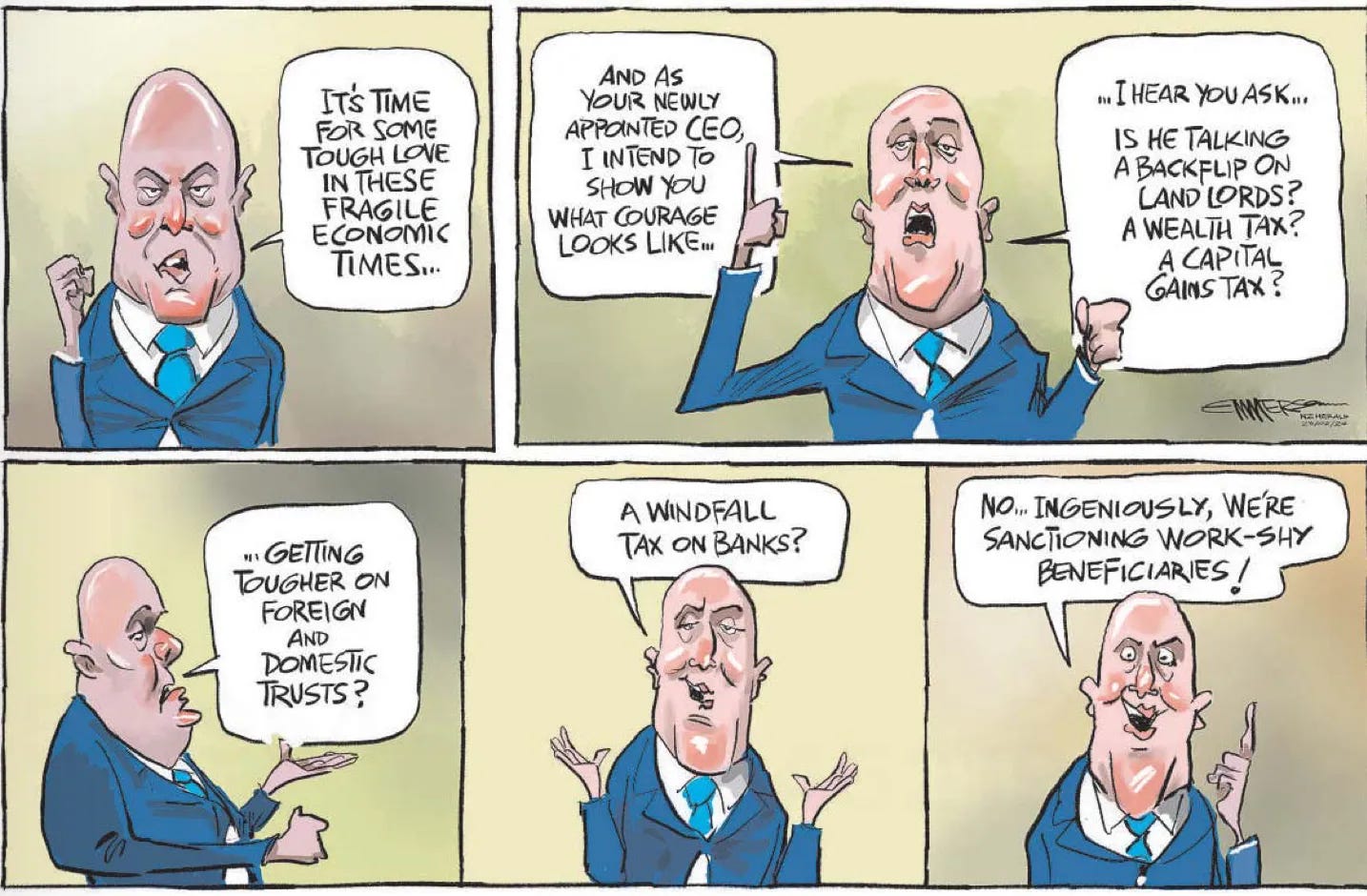 Here’s an excerpt from the speech: “The reality is, we’re in big, big trouble, so we’re going to have to make some tough choices. And the first of those tough choices is to decide who we are going to blame first for finding ourselves with tough choices. Should it be, say, uncompetitive supermarket chains making massive profits, giant multinationals paying bugger-all tax, rapacious Australian-owned banks making excessive profits, or greedy locals protecting their wealth and avoiding tax through trusts and property investments? Or it should be those trying to live on as little as $274.37 a week on a Jobseeker’s benefit? The answer is obvious, my friends. So let me say to those people on the Jobseeker’s, your free ride on the taxpayer cash cow is over. I am calling this the ‘tough luck’ approach, and I will not apologise for it. All Kiwis have a right to support when times are tough. But with that right also comes responsibility, especially if you can’t afford lobbyists in Wellington. And it’s your responsibility to look for work even as the job market tightens because of record net migration in 2023, and as the unemployment rate rises again partly because the Reserve Bank is keeping interest rates high in the hope this will help ease inflationary pressures. To you bludgers I say this – and make no mistake, my party of no new ideas says this every time we’re in government – you need to get a haircut and get a job.”