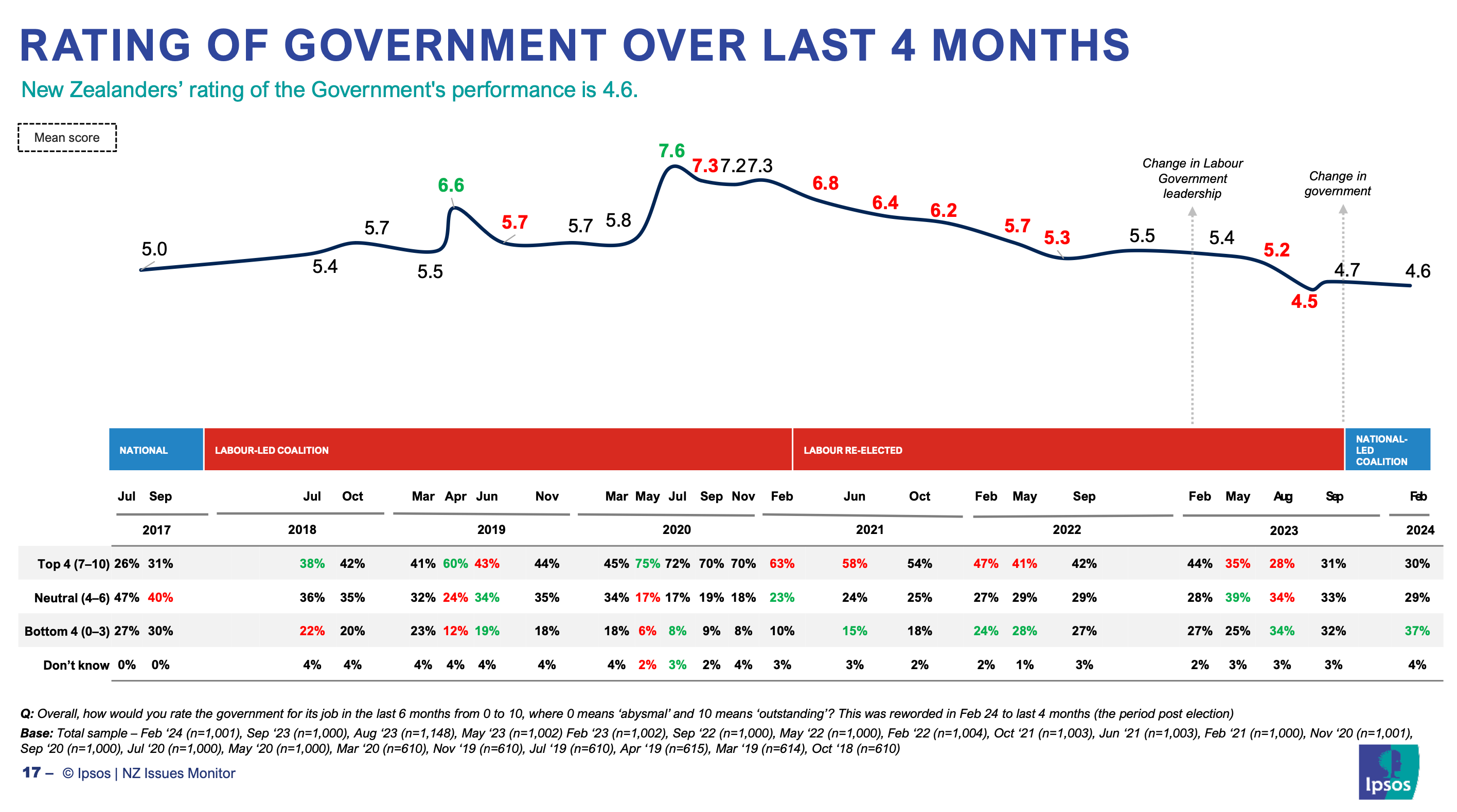 The most concerning survey result for the Government comes today from the IPSOS polling company, which released its latest “Issues Monitor” report, showing that New Zealanders rate the performance of the new Government at only 4.6 out of 10. You can see the full report here: IPSOS: 23rd Ipsos NZ Issues Monitor Feb 2024